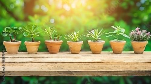 Seven Small Potted Plants Displayed on a Wooden Surface