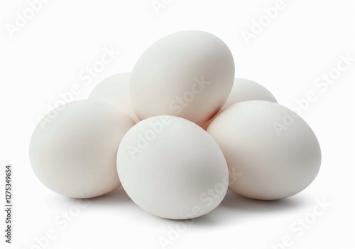 Seven white eggs, with their smooth texture and natural look, are grouped together in a simple composition