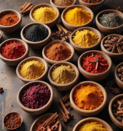 Several handmade wooden bowls filled with assorted spices like turmeric, red pepper, black pepper, and spice mix, kitchen essentials, culinary display, wooden containers, variety of seasonings