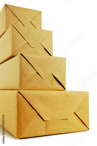 Several various small brown paper package parcel pile stack stacked isolated on white background photo