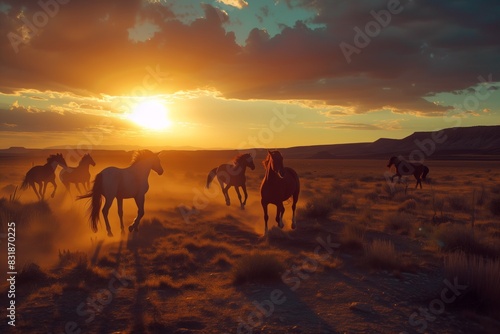 several wild horses are running across the desert