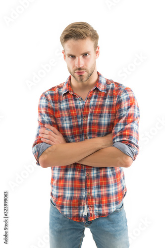 Sexy guy casual style. Masculinity concept. Man beauty model. Menswear shop. Manhood. Macho man wearing checkered shirt. Male fashion summer trends. Unshaven man skin care. Barbershop concept