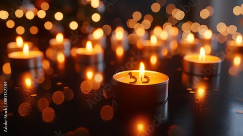 Shabbat Candles Glowing in the Dark with Bokeh Warm Atmosphere of Jewish Holiday, Close-up