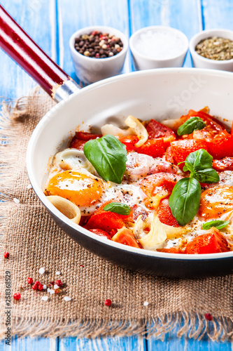 Shakshuka - fried eggs with vegetables in frying pan