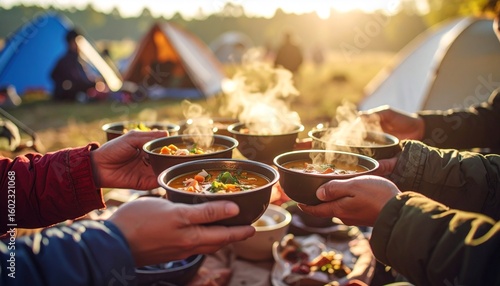 Sharing a warm meal together. Friends enjoying hot soup from bowls during a camping trip in the golden hour.