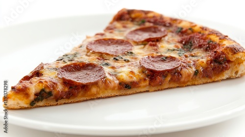 Sharp, in-focus top view of pepperoni pizza on a plate with clipping path, isolated on white background, ideal for food packaging and restaurant menu concepts.