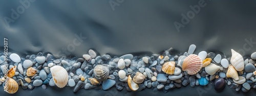 Shells pebbles and Clams with Ocean on Slate and Text Area