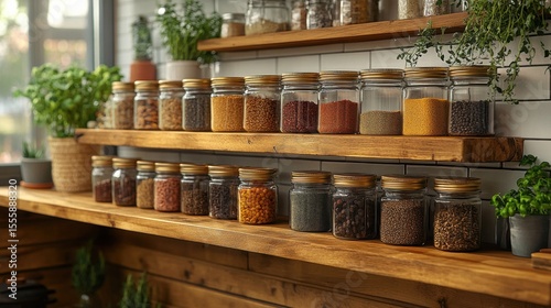 Shelves of Glass Jars Filled with Dried Goods and Plants