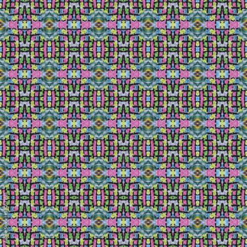 Shibori pattern. Ikat textile. Tie dye print. Multicolored seamless stencil. Moroccan tile. Folk geometric ornament. Japanese shibori pattern. Watercolor batik paint, silk fabric. Ethnic carpet motif