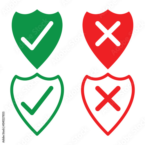 Shield with check mark and cross mark icon set. Protection and unprotection, green shield checkmark & red shield cross in eps 10.