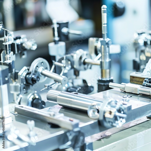Shining factory surfaces, tools in designated places, high angle, soft light, pristine and organized atmosphere, isolated on white background,