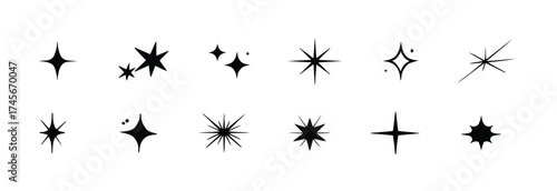 Shining glow sparkle mockups. Set of blink twinkle, sunburst star shapes. Abstract magic light flare, minimalist symbols. Stars templates pack isolated on a white background, vector illustration.