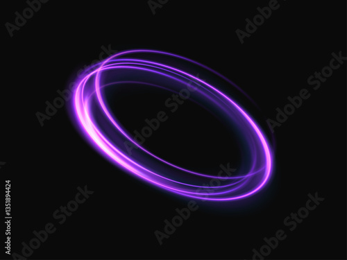 Shining ring with neon purple lines, mesmerizing light swirl. Glowing circle. Light speed effect. Deep black background, light motion effect.