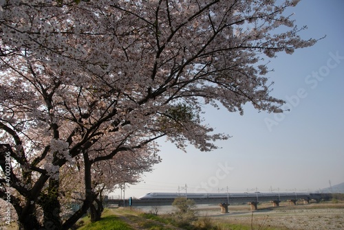 SHINKANSEN train running countryside with cherry blossom in full bloom