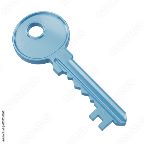 Shiny blue translucent key with a circular head and serrated bit isolated on transparent background