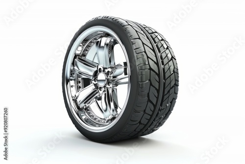 Shiny chrome car wheel with rubber tire on a white background. Simple and modern automotive style. Used for car maintenance and repair concepts. Generative AI