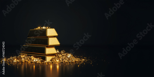 Shiny Gold Bars Stacked with Scattered Diamonds on a Dark Background