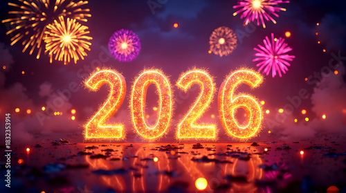 Shiny golden 2026 glowing against a dark sky with colorful fireworks