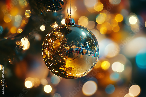 Shiny golden Christmas baubles with festive decorations and soft bokeh lights in the background
