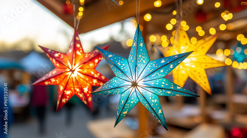 Shiny Red and Blue Christmas Star Ornaments, Golden Festive Lights, Holiday Market Stand, Winter Holiday Celebration and Sale.