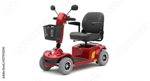 Shiny red four wheel mobility scooter with black seat and basket isolated on white background