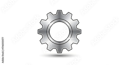 Shiny Silver Gear Icon with Metallic Glare and Black Outline on White Background, Representing Settings, Mechanics, and Technology