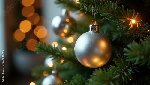 Shiny silver ornaments hung on a Christmas tree, sparkling garlands, festive centerpieces
