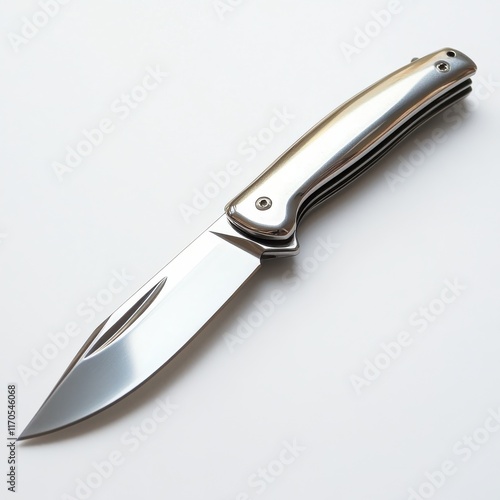 Shiny silver pocket knife with a sleek design resting on a neutral surface
