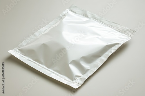 Shiny White Foil Pouch on Light Background, Sealed Plastic Pack for Food Item