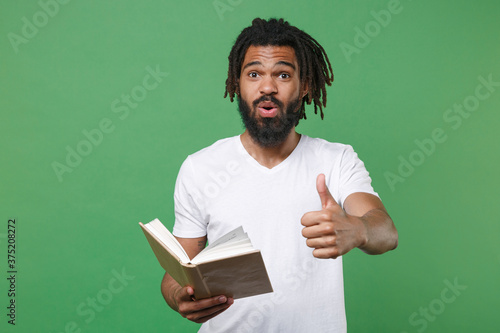 Shocked amazed young african american man guy with dreadlocks 20s wearing white casual t-shirt posing holding in hand reading book showing thumb up isolated on green color background studio portrait.