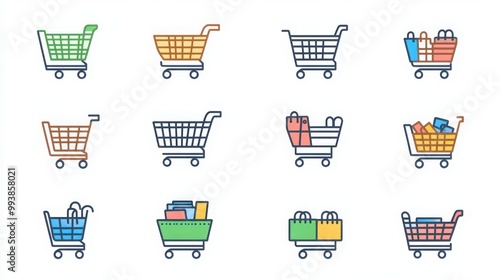 Shopping Cart thin line icon set. Example a checkout, cart with products, empty cart, cart with sale sign, online cart, cart with percentage discount