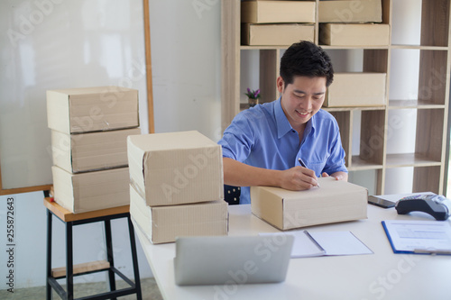 Shopping Online concept, Shipping shopping online,Young start up small business owner writing address on cardboard box with computer