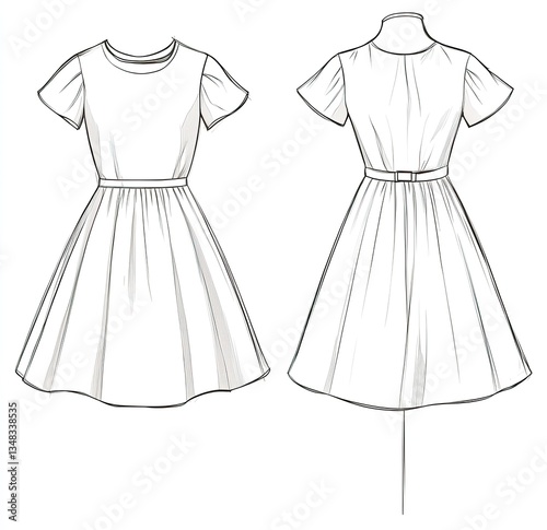 Short sleeve, belted, A-line dress technical drawing.