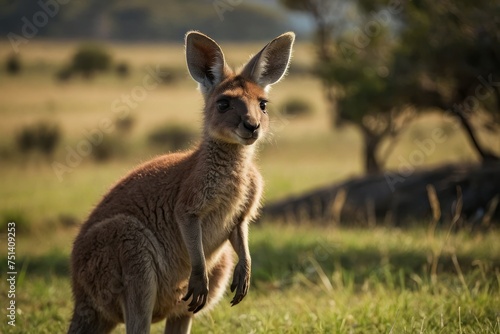 Shot of a baby kangaroo standing on a grassy field with a blurred background