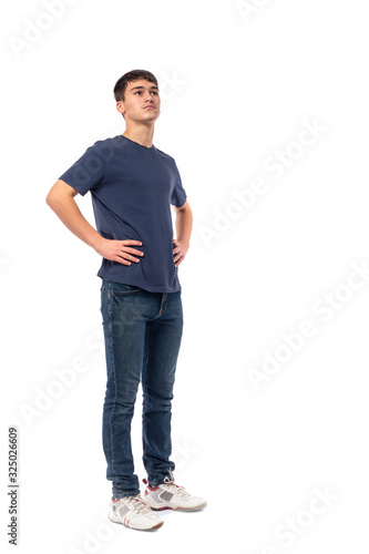 Shot of the young serious boy teenager of the brunette wearing blue shirt, isolated