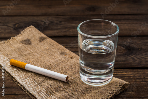 Shot of vodka with piece of cloth and cigarette on an old wooden table. Close up view