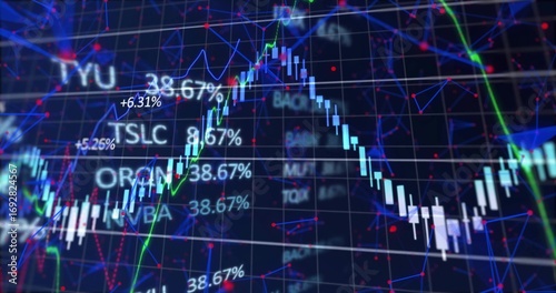 Showing candlestick, line graphs with %, ticker labels on trading screen grid, network node overlay
