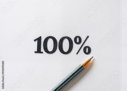 shows the number "100%" written in black on a white background, accompanied by a black pen with a gold-colored tip.