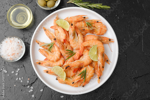 Shrimp dish with salt, olives and oil on slate background for tapas or Mediterranean appetizer concept