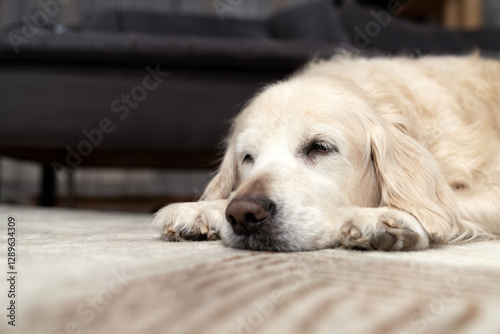 Sick, cold and tired golden retriever dog lying down, sleeping, resting, relaxing. Snot running out of big black nose. Dog on cozy carpet. Relaxed pet at home, comfort, aging flu dog, pet care concept