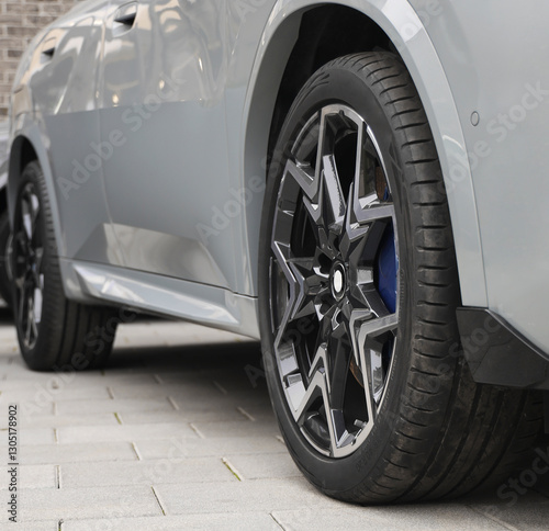 side back rear view Part of modern luxury new car. Wheels and tires wheel tyre tire of luxury vehicle sporty auto with a powerful braking system and discs. automobile perspective