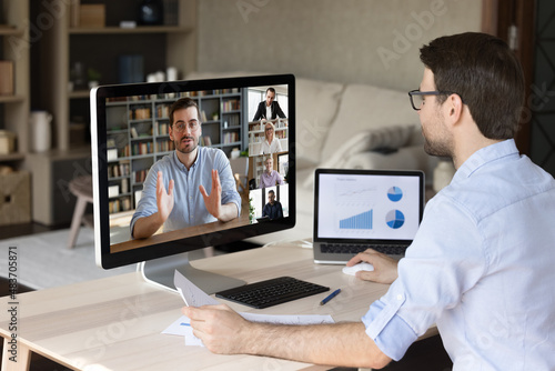 Side back view smiling young male employee working on different devices, holding video conference call conversation with team leader and diverse colleagues, discussing marketing research results.