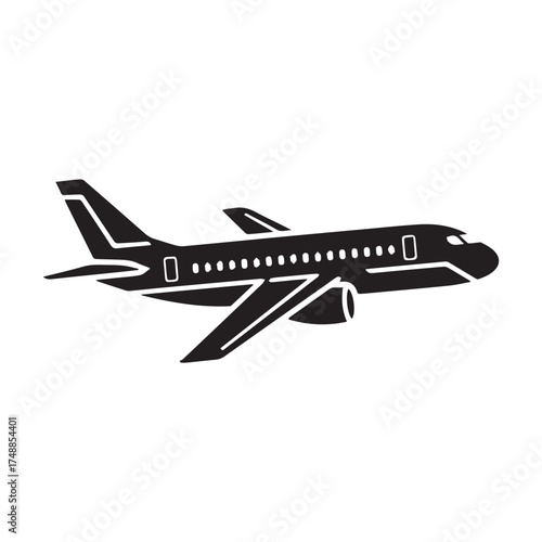 Side profile silhouette of a black jet airplane with visible windows and engines on a white background