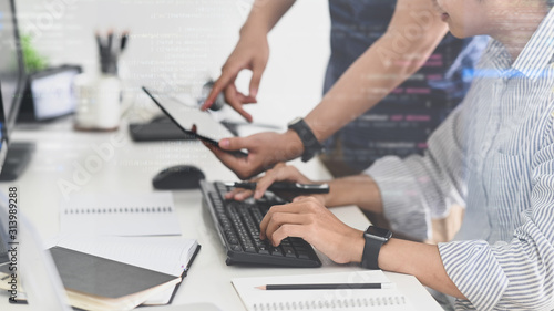 Side shot of young Programmer team while brainstorming/deciding on work at the work desk.