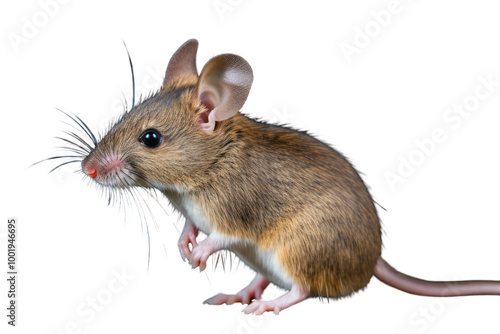 Side view of a mouse with large ears, sniffing the air, with a blurred background of a natural habitat isolated on white background