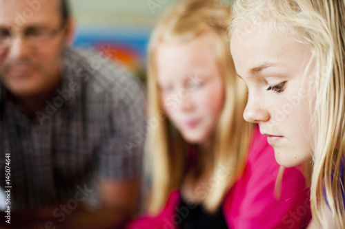 Side view of girl with friend and professor in classroom
