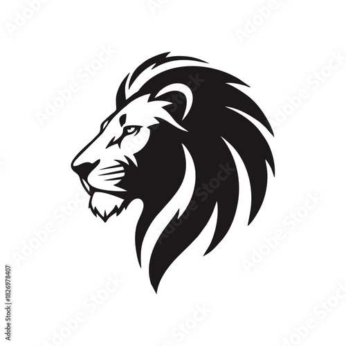 Side-profile lion head logo, elegant flowing mane, sharp clean vector lines, strong and majestic expression, minimalist black and white style, smooth curved shapes, modern emblem design, bold silhouet