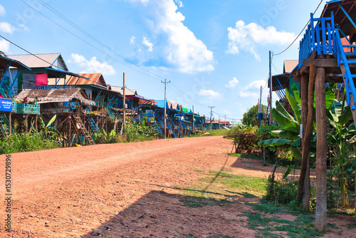 SIEM REAP, CAMBODIA - APRIL 28, 2022: KAMPONG PHLUK FLOATING VILLAGE during the dry season on a hot sunny day. Post covid-19 pandemic landscape.