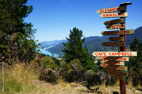 Signpost in Queen Charlotte Track showing direction and distance to towns and touristic places in New Zealand