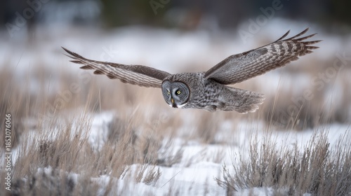 Silent Flight: A Great Grey Owl soars gracefully through the air, its wings outstretched against a blurry background. Capturing the essence of freedom and the quiet beauty of nature's aerial acrobat.